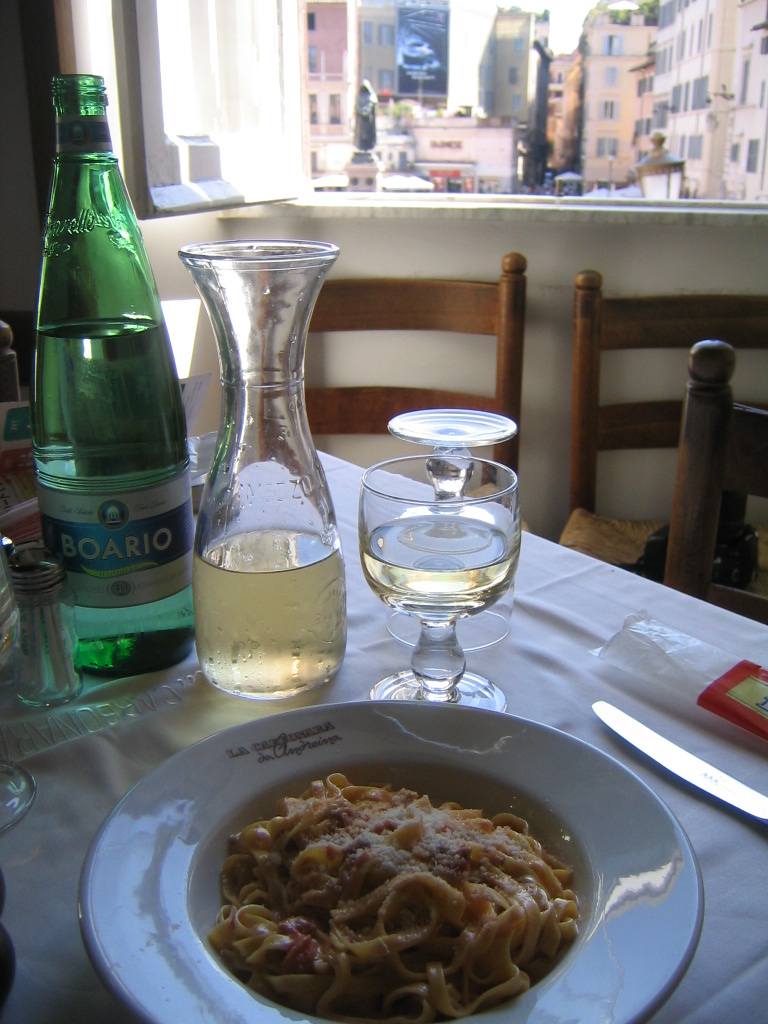 日本なら到底考えられないが、それがイタリア。ラ・カルボナーラも閉店ならどうしよう・・・と思ったら、広場の奥の方にどっしりした作りのお店が、オープンカフェまで展開して繁盛している。ラ・カルボナーラだ。安心からか一気にお腹が減る。早速中に入り、カルボナーラを注文。美味しい! パルメザンチーズではない、他のチーズの濃厚な香りとカリカリのベーコンが一気に空腹を満たした。満足満足。次なる目的地パンテオンまでの足取りが軽くなった。