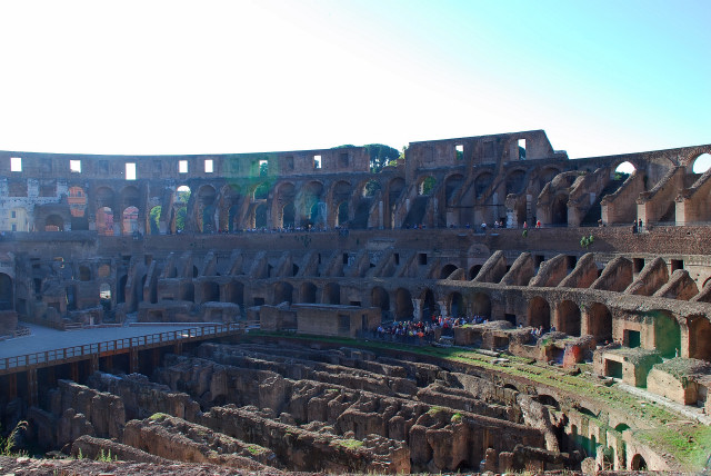 2Fからの写真。かつての国民の娯楽であった剣奴や猛獣が収容されていた地下部分がむき出しになっている。遺跡の雰囲気に似合わず、2Fへはエレベータで上がるようになっていた。