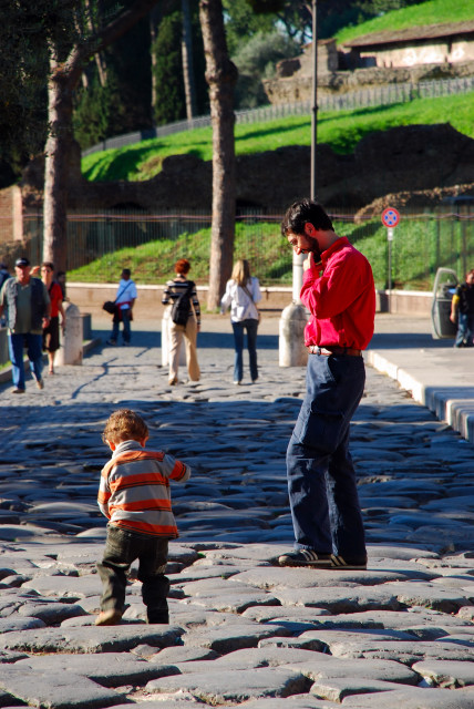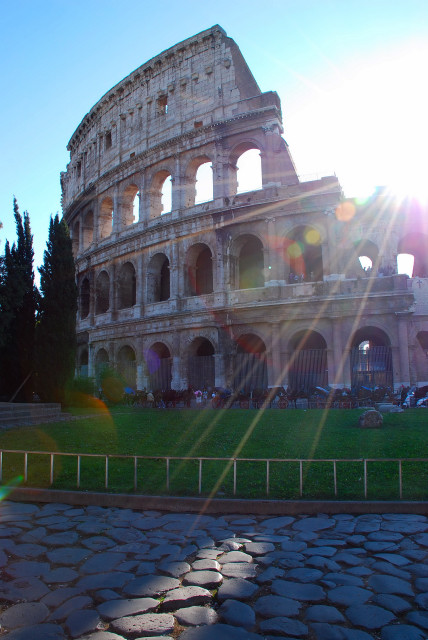 コロッセオはでかい。しかも角度によって見え方が違ってくる。瓦礫の様に崩れている部分を含んで写すのが一番美しく感じたので、構図を決めるが、通行人やら停車中のトラックなどが入りこみ、なかなかポイントが見つからない。逆光になりながらも遂に見つけたポイント。でも通行人と車も入ってしまった・・・