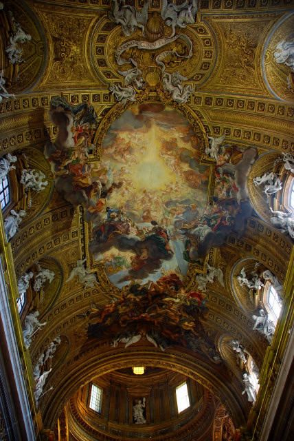 ジェズ教会内部、バチッチャによる天井画【キリストの御名の勝利】。実はこの教会に来た理由は、この天井画にもある。トリックアートの様に画枠から飛び出した雲や天使の姿を肉眼で見たかったのだ。感想:すげ~。だって、それ以上何も言えないよ。本当に凄いから!