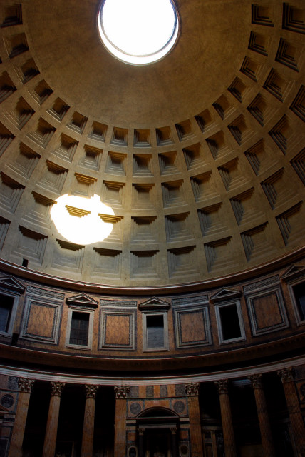 パンテオン内部。天窓から漏れる光が、新たな光を作る。天窓が太陽を意味し、壁面に写る光が月を意味している、と思ったのだが、真相は分からず。誰か知っている人がいたら教えてください。