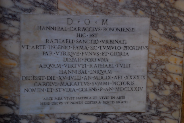 ラファエッロが眠る墓の横にある石碑。ラファエッロ・サンティの文字がある。