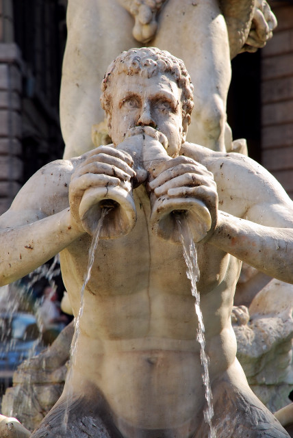 旅の最後の目的地ナヴォーナ広場へと向かう。ローマっ子憩いの広場として人気を2分するカンポ・ディ・フィオーリ広場とナヴォーナ広場。ナヴォーナ広場には、ベルニーニ作の【4大河の噴水】がる。ベルニーニの出生作としても有名なこの噴水は、ナイル、ガンジス、ドナウ、ラプラタ川を意味する像で装飾され、キリスト教が世界に君臨している事を意味しているそうだ。キリスト教世界にどっぷりと触れる旅の締めくくりには丁度いい。ここで、ドルチェでも食べながらのんびりと鑑賞しようと思ったのだが・・・・。そう、ここも工事中。噴水の周りを無機質な立ち入り禁止ガードがぐるっと取り巻いていた。仕方がない、歴史的遺産を後世に残していく為にも定期的な修復が必要なのは当然の事。また今度くればいい。次に来る為の理由ができたじゃないか。ナヴォーナ広場横にあるリストランテでカプティーノをすすりながら、そう思った。 ムーア人の噴水